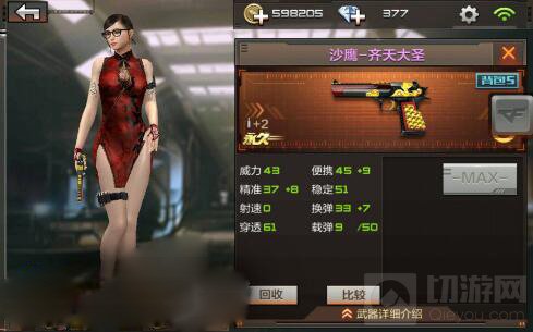 沙鹰-齐天大圣,猴年专属纪念手枪在属性中自然也不会差,在搭配齐天大圣套装后,穿透属性又将提升一个档次,且独特的猴年元素外观将其打造成独一无二的近战利器。