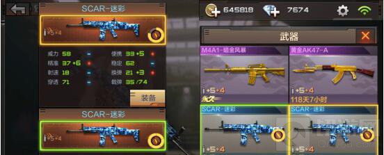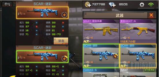 我们来通过升级精通,看图对比来看SCAR—迷彩精通升级之后的属性: