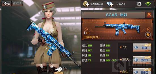 SCAR-迷彩这把枪是在SCAR的基础上进行强化提升,不仅在枪身上增加了迷彩涂装,看上去更加炫酷,属性上也提升了换弹速度,使性能更加全面,而且其高精准的特性非常受喜欢点射的小伙伴喜爱!