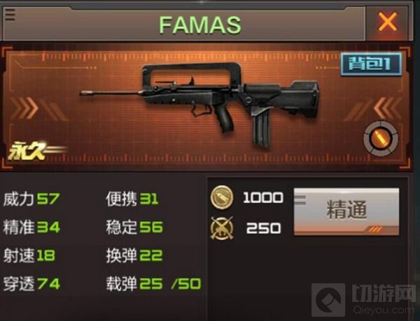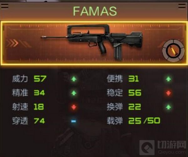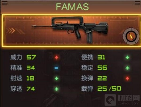 FAMAS是CF手游中十分亲民的武器之一,弹容量虽然较低,但是射速较快,伤害中等,十分适合玩家进行中距离的交火。下面切游就详细给大家介绍一下这款武器的属性特点。