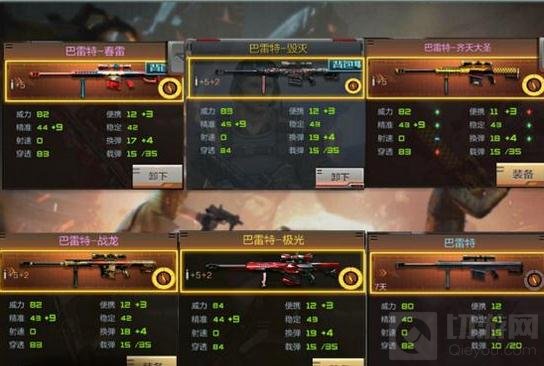 这是同系列现有商城的所有巴雷特枪械,从我们刚开始的巴雷特到后来钻石靶场出现的巴雷特-战龙,以及后来为了庆祝猴年出的稀有套装巴雷特-齐天大圣,庆祝欢度元宵节出的巴雷特-春雷,再就是后来的巴雷特-极光,以及现在发布的巴雷特-毁灭,可以说巴雷特-毁灭的发布历经曲折。再从我们看到数据中,巴雷特-毁灭威力比巴雷特-极光低一个点,而在枪械的精准上又略高极光一个点,可以说是打成平手了,但在我个人看来巴雷特系列的枪支威力本来就不容小觑,所以多少一两个点是没有区别的,然而加到其他的属性上那就非同小可了.