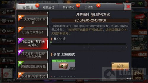 开学福利大放送,每日参与指定模式达到次数,即可获得对应模式宝箱。(宝箱可可开出数量不等的钻石,还能获得M1014-火焰碎片!)