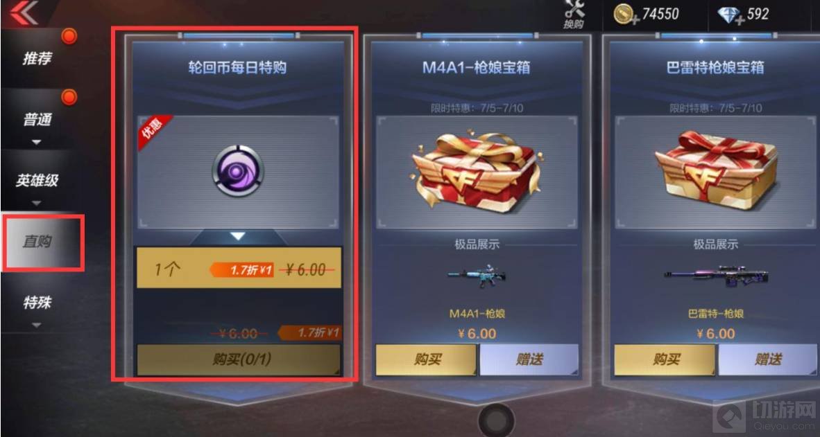 2、先打开商城,然后点击直购就能发现这里竟然也能买轮回币,轮回币原价6块,而这里竟然打1.7折,相当于1块钱一个轮回币了,但一天只能买一个。