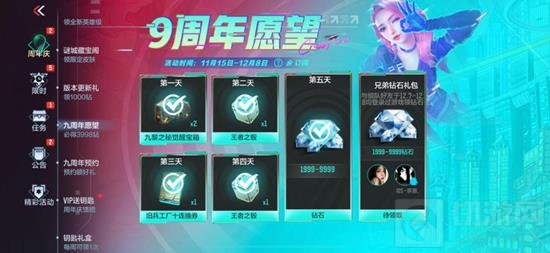 9周年愿望大家都组队参加了吗?活动时间为11月15日至12月8日,在活动期间累计登录5天游戏即可抽1999-9999钻石。与组队好友于12月7日-12月8日均登录过游戏即可领取兄弟钻石礼包,再抽一次1999-9999钻石。兄弟,兄弟,一定要记得登录游戏!