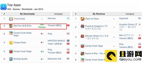 考虑到App Annie的数据仅统计了中国的iOS平台,因此中国发行商推出的手游在iOS榜单的变化是非常值得注意的。在2015年1月的排行榜上,凭借微信游戏中心和手Q游戏平台的强大影响力,腾讯的新游戏《全民突击》成功占据全球iOS下载榜第二名,另外值得注意的是,乐元互动的《开心消消乐》下载排名也增长18位,成为1月份iOS全球下载榜第8名。