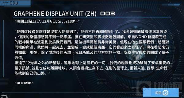 GDU(GRAPHENE DISPLAY UNIT)在游戏中是一个记录对话咨询的装置,玩家可以透过GDU系统看到大量的剧情内容。它在每一关卡的进入界面,多了一个入口,让你可以点进去直接观看本关卡的背景故事剧情,每个关卡有5则讯息。字数不多,但对于游戏背后的那一片世界,披露了很多之前大家从未了解的内容。