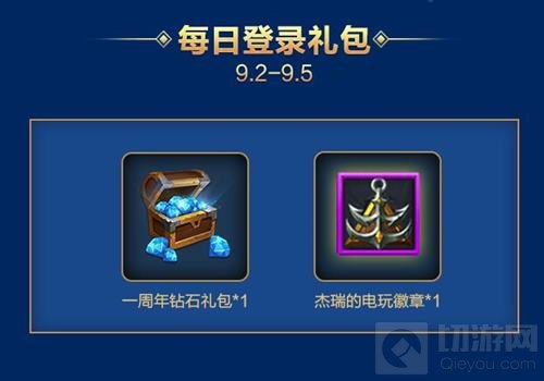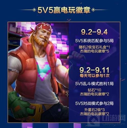 9.2~9.11(每天可以参与1次),5V5乱斗模式胜利1局,钻石*10,杰瑞的电玩徽章*2;5V5对战模式参与2局,升星石2级*3,杰瑞的电玩徽章*2