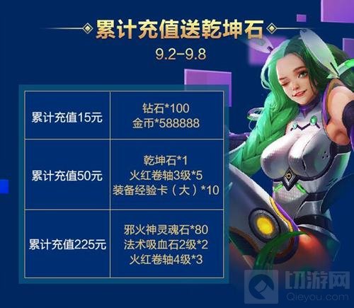 累计充值50元,乾坤石*1,火红卷轴3级*5,装备经验卡(大)*10