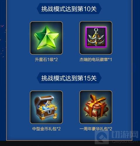 挑战模式达到第10关,可得升星石1级*2,杰瑞的电玩徽章*1