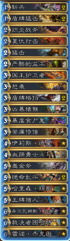 恩佐斯奶骑:起手留和找小斧头(包括3费国王护卫者),怒袭,猛击,监工,乱斗,苦痛, 墙,哈里森。这是一个劣势对局。一定要留一个乱斗给他的恩佐斯一波,所以如何运用自己手中的解牌和资源是关键。但是这类骑士的中前期生物较少,主要是应对 他后期的大生物,解牌跟上就行。时刻关注双方牌库,由于这类骑士过牌很多,很容易比我们先进去疲劳,我们争取通过疲劳也是获胜方式一种。整体劣势。战士:起 手留和找乱斗,图哈特,哈里森。大家注意,这里我说的对局是“战士”,目前战士形态有奴隶战,挖宝防战,克苏恩防战和刚刚火起来的中速瓦王战。如果是防 战,我们怎么留牌都能打,毕竟是大后期对局,所以,不考虑如何留牌针对。那么,我们起手和找牌只针对其他形态战士。乱斗打奴隶战和瓦王战不用说了,图哈特 打各形态战士也是必留,哈里森同理。奴隶战,较上版本更加弱了,对抗双乱斗防战简直不知道怎么赢。克苏恩防战,处理掉所有生物一点问题没有,面对高护甲防 战,克苏恩的战吼基本打不痛,需要注意的是厄运召唤者(让克苏恩重新进牌库),做好处理第二个克苏恩的准备。内战,不要过牌,尽可能让对手手牌先满,他出 怪,你解场,其实双方都挖宝,最后还是橙卡拼脸大作战。重点说一下中速瓦王战。这套卡组登顶了,很火,大家纷纷效仿,作为一个老战士,我想说,这卡组简直 弱爆了,之所以能登顶有强度,因为大家不熟悉这套牌,同时又和奴隶战有点像,一时半会不好判断形态,总想着留aoe给奴隶主。但是知道了中速战的套路,我 们用防战打起来,简直不要再简单,橙卡又不多,一个解牌一个解牌交过去就行,如果瓦王铺,乱斗带飞。同时中速战过牌还多,很容易进疲劳,应对好中速战的场 面,很容易获胜,大优势对局。