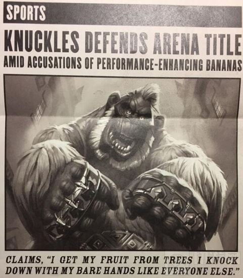 无敌金刚继续卫冕竞技场这只叫Knuckles的金刚已经在竞技场连胜32场,有很多人怀疑它嗑药了。因为它最喜欢吃的香蕉一定要从一个被污染池塘旁边的果园摘取。但地精为了钱肯定不会对这样的事情进行调查。卖药的暗金教在操控比赛。