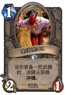 南海船工:现在环境和当年不同,1费一个随从已经不强势了,需要2个,对于这套牌,除了迷失丛林,要想1费足够强势有2个随从,帕奇斯体系是必须的。而选择2/1而不选择1/2海盗。主要考虑我们带了4把武器,2/1海盗除了攻击力高,打脸能力也强,冲锋触发率很高,拖到后面也容易补伤害,而不像1/2那么无力。