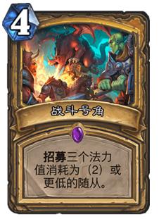 战斗号角:4费招募3个2费及以下随从,瞬间铺3个,可以和飞刀配合,同时不管怎么算都不亏,4费抽3张,不需要水晶直接上场,只要三个里面有一个2费的,就是白赚3张卡。