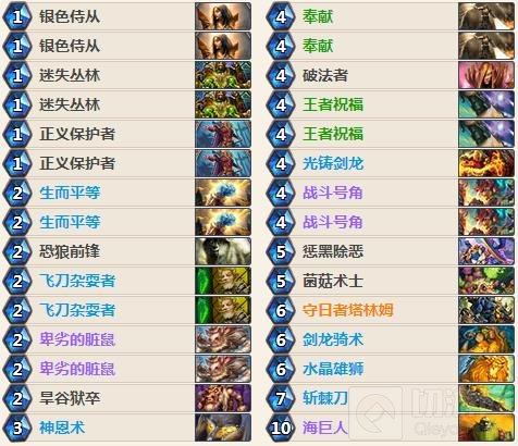 快攻骑主要依靠前中期的出色铺场能力取胜。这套卡组带了大量的优质低费随从,并且带上了可以用来扩大优势的菌菇术士、光铸剑龙、水晶雄狮以及守日者。我们前期的铺场能力很强,中期战斗号角更是优质的铺场手段,这常常能保证我们在五六费时能掌握场面。此外,为了充分发挥出蒲城能力强的优势,我们还带上了海巨人。由于我们的铺场以数量见长,在遇到以质量为主的铺场卡组(比如龙牧)时,我们的生而平等就能发挥出优势。