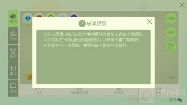 1、战队成员通过参加战队比赛,根据最终比赛的胜负适当的增加或减少奖杯数;