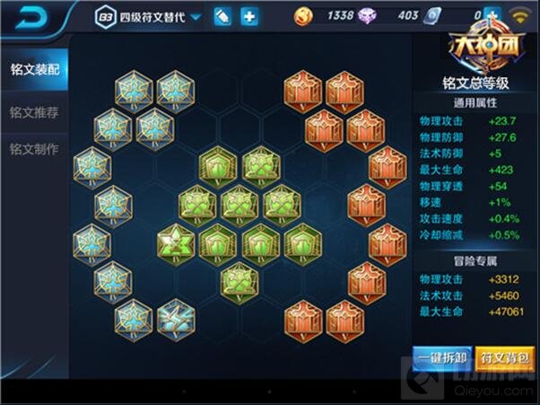 虽然《王者荣耀》开测以来有很长一段时间了,但是陆陆续续进来的新手玩家还有很多还是不能凑齐一套5级铭文,或者只有部分铭文,这时候我们就要进行考虑用其它属性的铭文进行替代, 可以是3级、4级也可以1级、2级的,当然前提是选择正确属性进行代替。像宫本吸血属性,在低级铭文中很少,就算有数值也不高,性价比很低,索性可以直接用物理攻击或者物理护甲穿甲之类的铭文进行替换,来的更加实际,像移速也是一样的低级铭文中凑足5%也是不易的,效果并不佳,可以改成更加实用的最大生命值属性的铭文代替实用,增加自身的一定站桩输出能力。其他物理攻击和物理护甲穿透已久不变,不管低级还是高级铭文都可以轻易找到。