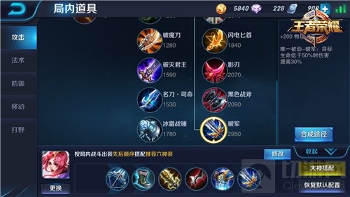 出装推荐:破甲弓,无尽刀锋,泣血之刃,抵抗之靴,贤者的庇护(名刀·司命),破军
