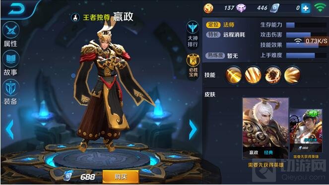 技能加点:王者惩戒是很好的消耗技能,前期是非常疼的,尽量优先点满。二技能王者守御点一级就够了。因为在嬴政的巅峰是在两个大件以后,所以前期主要利用二技能的移速。