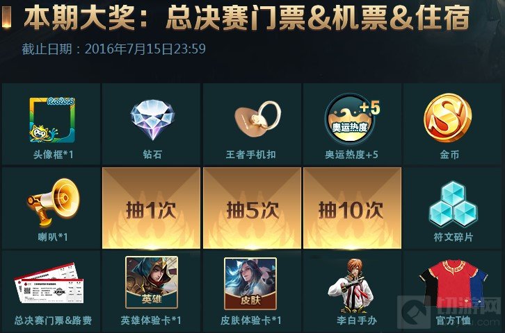 第一期(7.5-7.15):王者冠军杯盛典门票+来回机票+住宿,获得此奖励的玩家,我们将会在第一期抽奖结束之后,电话和您联系。