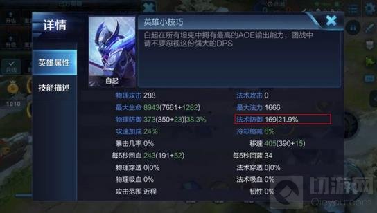 以白起为例,一级拥有50法术防御,每级会自然增长8.5左右的法术防御属性,到达15级之后,拥有169的法术防御,能减免21.9%的魔法伤害。