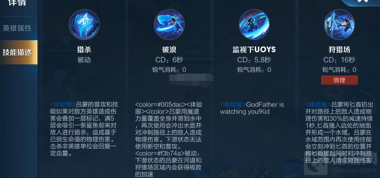 一技能:潜到水中,再次使用会冲出睡眠并对冲刺路径上的敌人造成物理伤害,下潜的状态无法使用断空(可能是二技能)和普攻,下潜状态的吕蒙,在河道和大招范围内会获得极致加速。