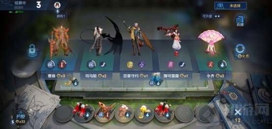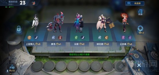 右下角的是你的金钱,可以用来购买上阵英雄,也可以用来升级人口,人口越多,你的优势就越大。开局的时候可以选择3个英雄。可以选择花费金币少的,也可以按你在这局游戏中所要走的方向,来选择你买的英雄。