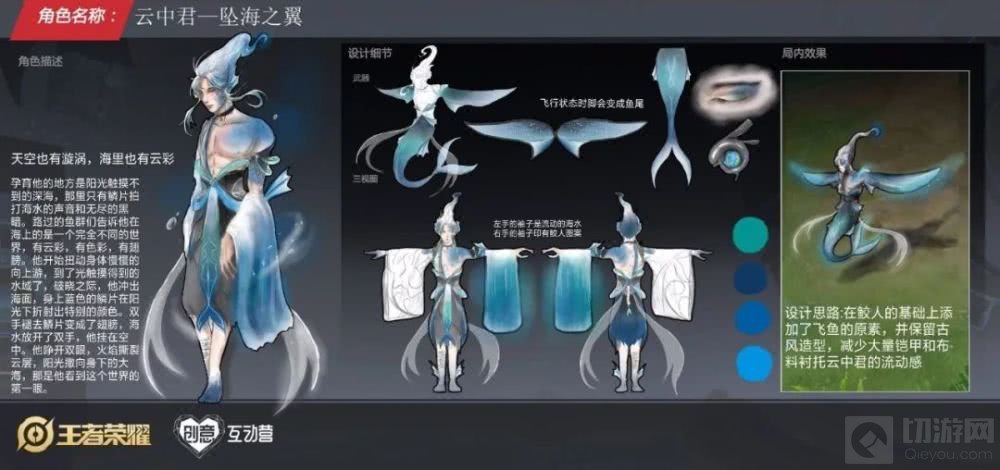 “坠海之翼”这款皮肤,云中君化身为鲛人,而且是一位飞鱼鲛人。皮肤以蓝色作为主色调,与大海的意向融为一体,如果王者荣耀想要在游戏中加入大海元素,云中君这款坠海之翼也就必不可少了。