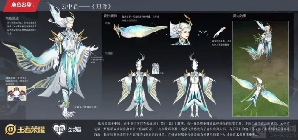这款“归鸢”皮肤的创意也十分独特,以纸鸢作为原型,将云中君设计为墨子设计出的用于作战的纸鸢——刚好可与鲁班大师的鲁班组一条故事线。如果王者荣耀的脑洞真的够大,这款皮肤设计的创意倒不失为一个好方向。