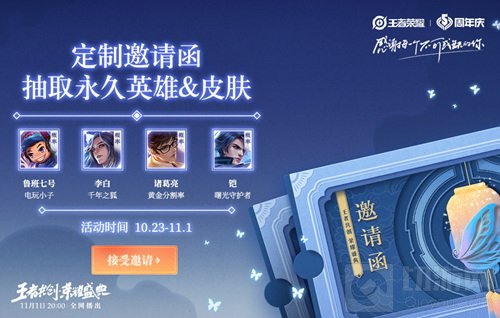 首先是定制邀请函抽英雄皮肤的活动。各位玩家参与盛典的邀请函活动,就有机会领取到永久英雄或者皮肤,皮肤有鲁班的电玩小子、李白的千年之狐、诸葛亮的黄金分割率和铠的曙光守护者。定制完后在图片的右上角有个刮刮卡,刮开就有机会赢取皮肤哦!(每个账号最多仅能获得1次抽奖机会)这个活动已经放出,入口就在王者荣耀游戏内的【活动】-【限时】里,感兴趣的玩家可以去参加一下哦!