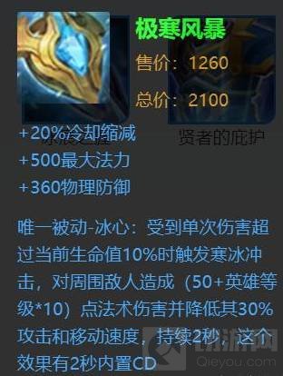 第四件装备是极寒风暴,极寒风暴最大的作用是减少技能的冷却时间、受到攻击时降低敌方的移动速度、还能增加物理防御。