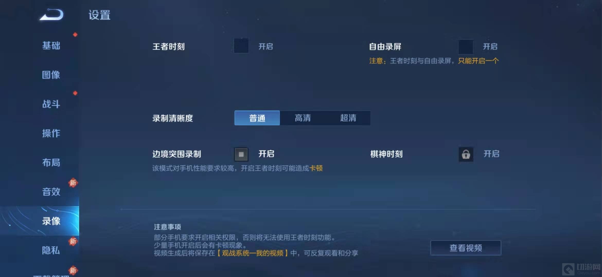 设置里面找到录像那一栏,点击王者时刻有些手机会提示要求开启相关权限,请根据指引开启对应的权限,否则将无法开启王者时刻功能。