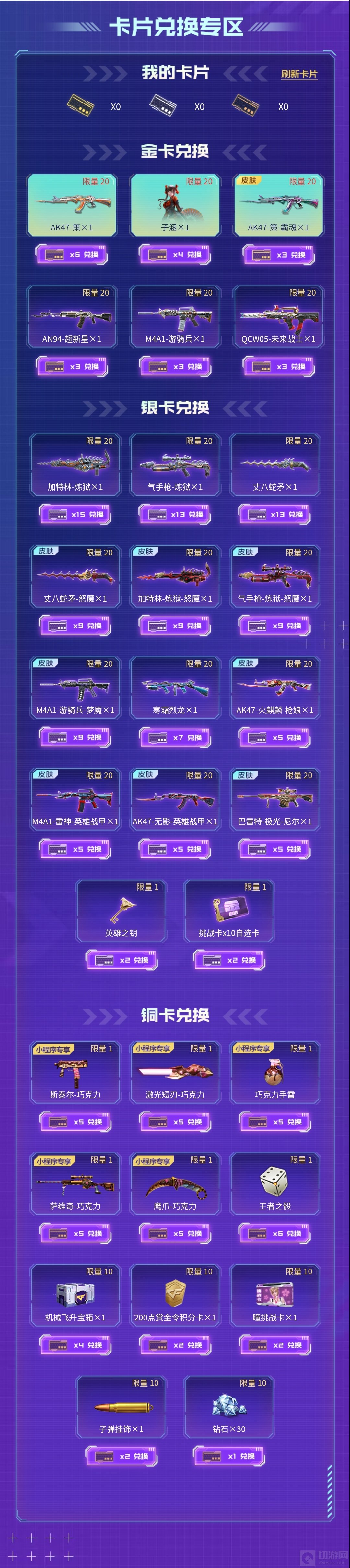 本次“幸运许愿池”活动于8月19日开启,9月14日结束,届时各位CFer们可以前往游戏大厅右下方的精彩活动参加。与常规抽奖活动相似,各位小伙伴们可以花费6元购买1把抽奖钥匙,50元10把,328元66把,648元135把,抽奖可获得不同等级的卡牌以及其它道具,低等级卡片可按一定比例合成高级卡片,不同数量卡片可兑换相应道具。值得注意的是,此次活动为道聚城抽奖活动,所以只会累计VIP成长值,并不会增加火线幸运点哦~