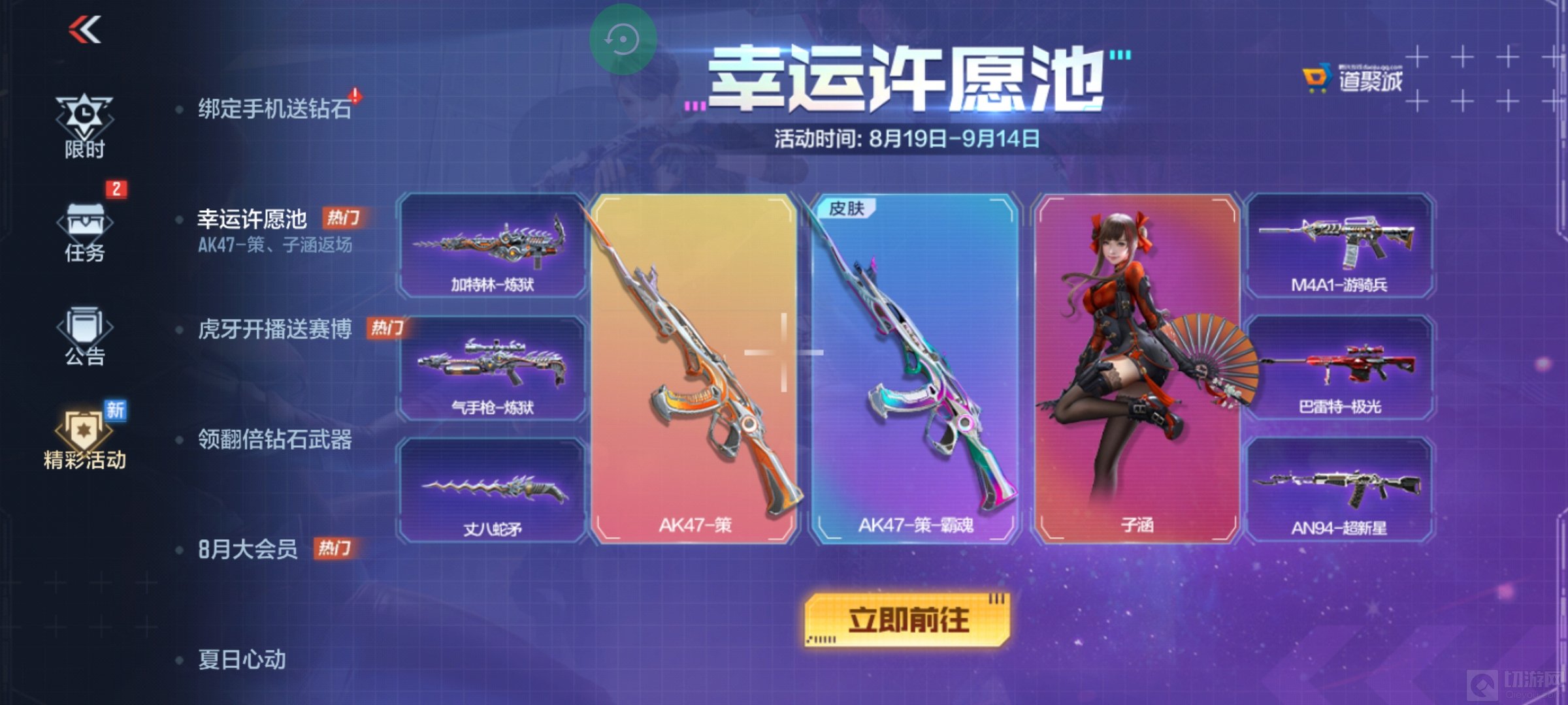 哈喽各位小伙伴们大家好,欢迎来到本期活动资讯。幸运许愿池上线CFM,孙策子涵携手游骑兵重磅返场!各位CFer们期待已久的人气国风少女-子涵她终于回来啦!除此之外,各位巅峰赛职业排位陀M4大佬喜爱的M4A1-游骑兵以及可以变形AA12喷子的AK47-策也在返场队列中,快跟小编一起来看看吧~