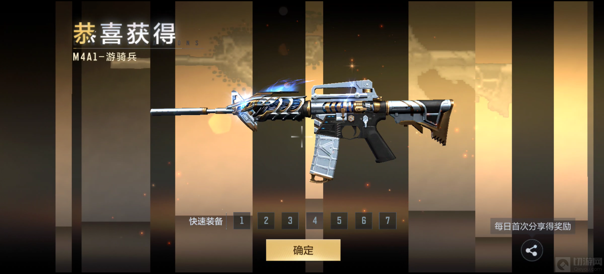 最后就来看看咱们的热门大奖M4A1-游骑兵啦。这把武器想必小编已经不需要再过多阐述其强势,英武的银色盔甲,轻飘写意的蓝色微光,如智慧勇敢的游骑兵在等候下一次的出击!拥有超强稳定性以及更快瞄准速度,陀螺仪M4大佬们最爱的步枪之一。