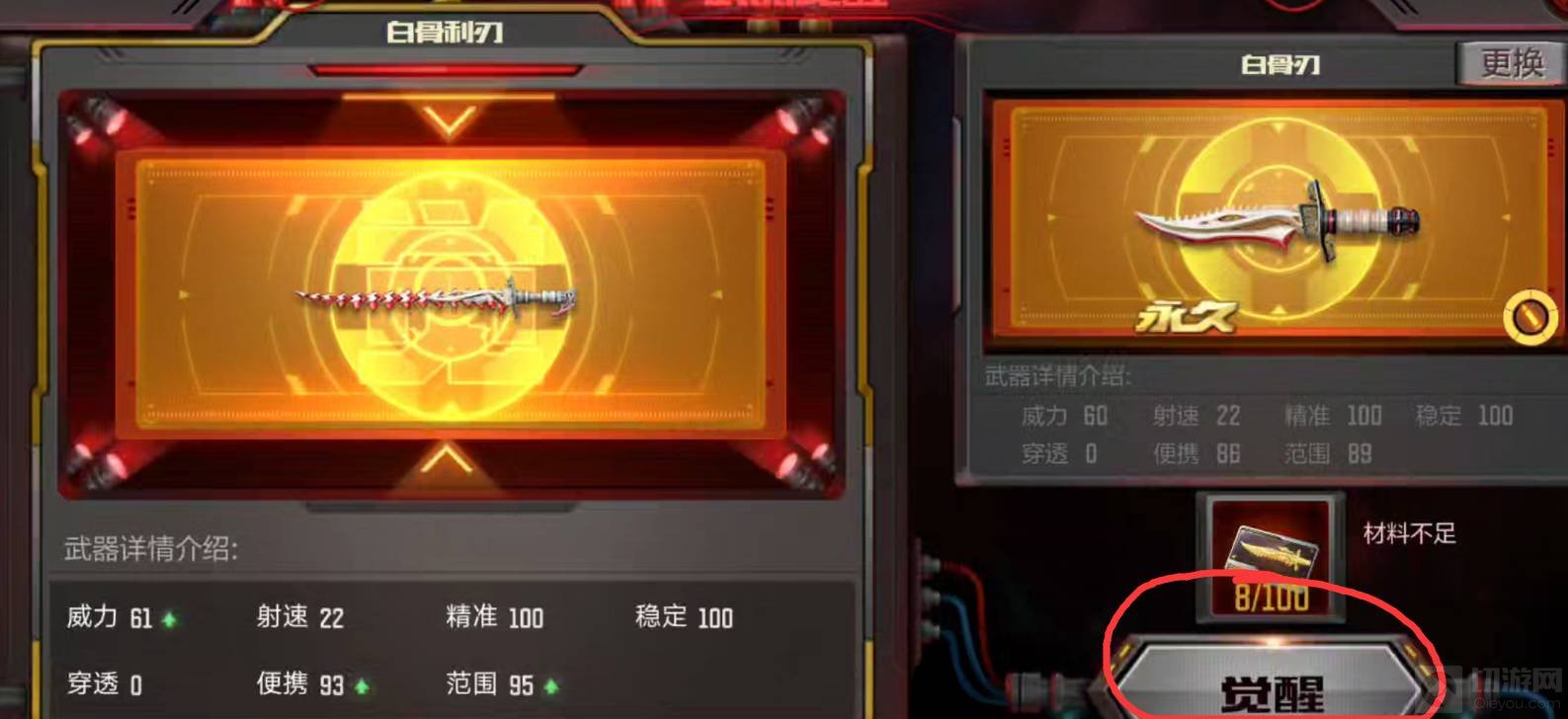 2、进入觉醒面板后,发现可以通过使用100个觉醒石将白骨刃觉醒成白骨利刃。
