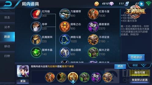 作为一名辅助,刘邦的第一件装备必然是红莲斗篷,性价比高。在团战的过程中,奔狼纹章所佩戴的主动技能同样能给队友的输出带来小幅度的提升,30的移动速度可以为残血的队友更快的脱离战场。另外三件装备则是大幅提升了刘邦的生存能力,并间接提高了刘邦的被动伤害。
