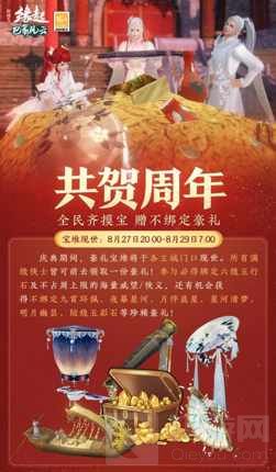 庆典宝堆送福利。8月27日20:00-8月29日7:00,庆典宝堆降临各大主城门口!所有满级侠士皆可前去一享庆典盛欢!绑定版五行石(六级)等威望/侠义道具100%掉落,还有不绑定版九霄环佩、夜幕星河、月伴晨星、星河清梦、明月幽昙、陆级五彩石等珍稀豪礼惊喜闪现!