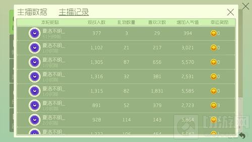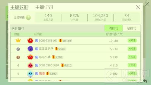 我们可以点开人气小图标,就会来到一个数据界面,分为主播数据和主播记录,其中主播数据界面包含的内容有主播等级,主播次数,主播人气值,观战总人数,全球排名,还有大家最关心的送礼排行榜哦!