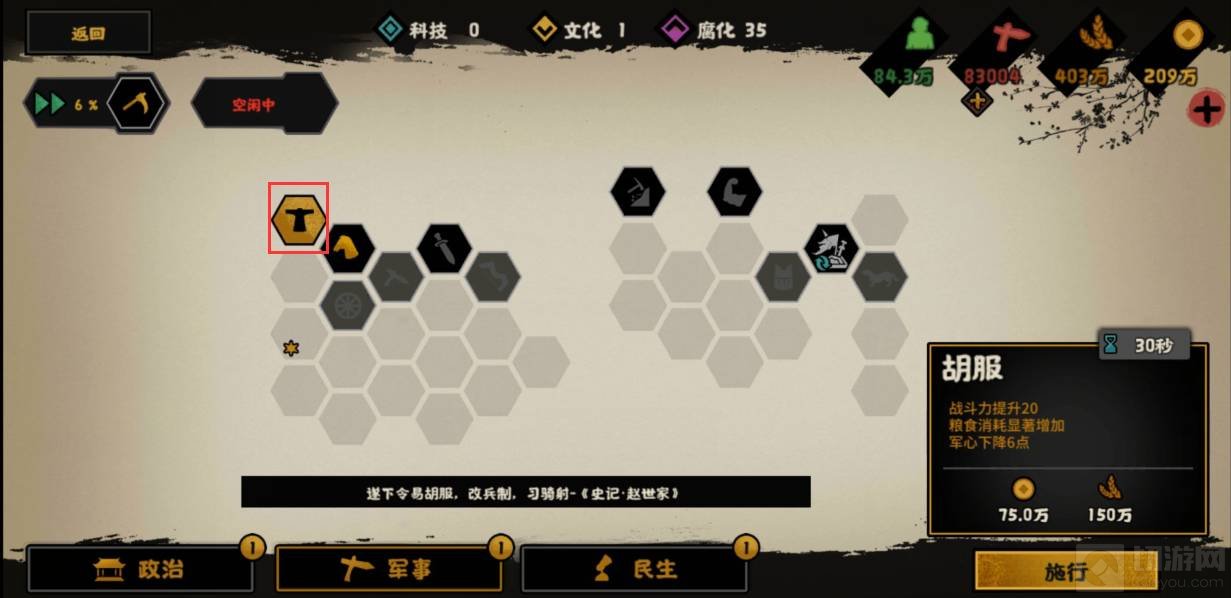 2、在军事一栏里就可以找到胡服了,点击施行政策即可,当政策施行结束就可以完成胡服骑射的事件了。