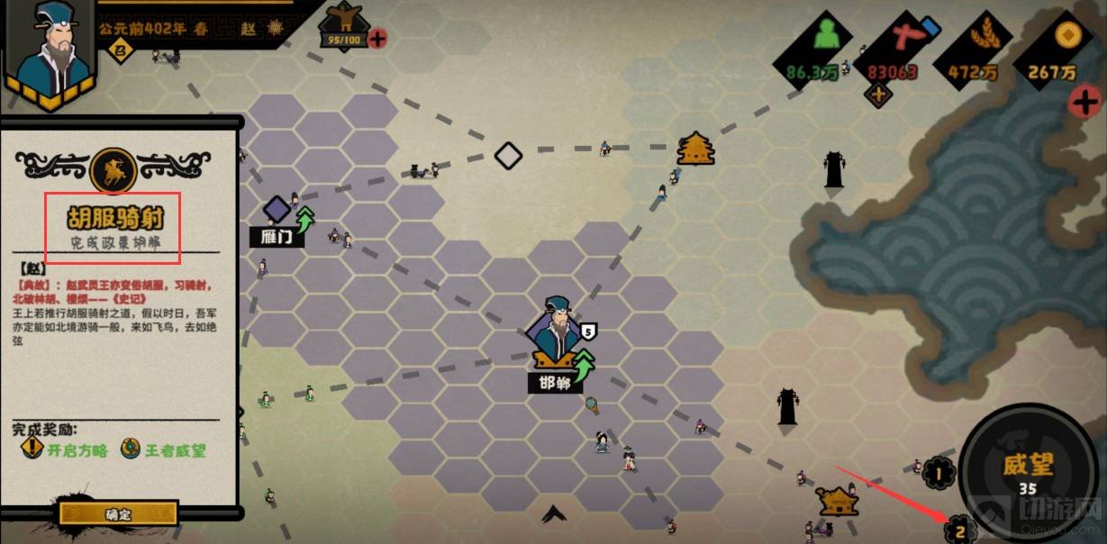 1、领取了胡服骑射事件之后,可以看到需要完成政策胡服,点击右下角威望旁边的政策图标。