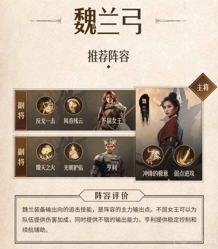 8、魏兰弓阵容搭配玩法如下:魏兰装备输出向的追击技能,是阵容的主力输出点。不屈女王可以为队伍提供伤害加成,同时提供不错的输出能力。亨利提供稳定控制和续航辅助。