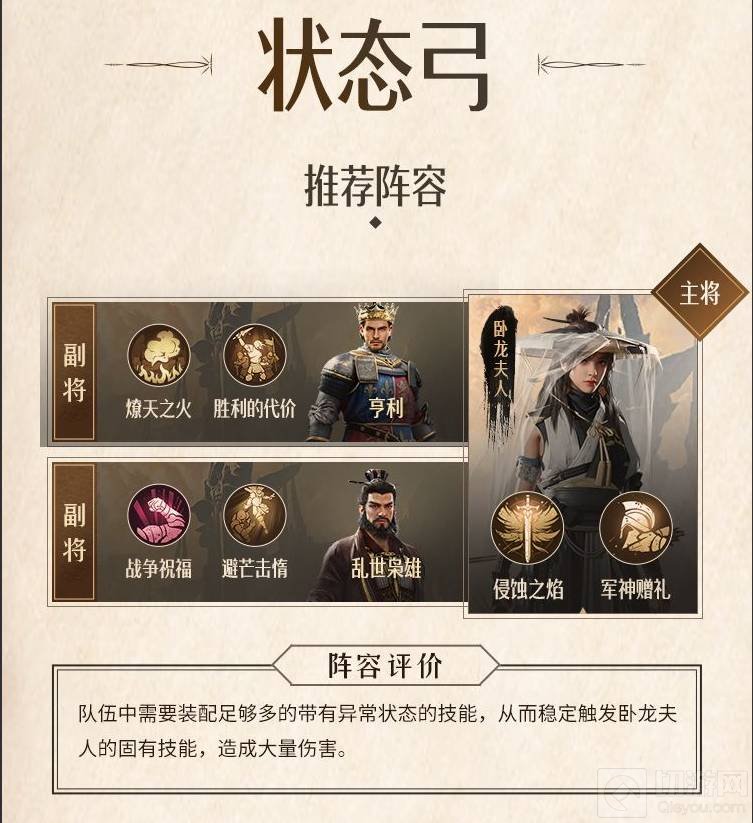 7、状态弓阵容搭配玩法如下:队伍中需要装配足够多的带有异常状态的技能,从而稳定触发卧龙夫人的固有技能,造成大量伤害。