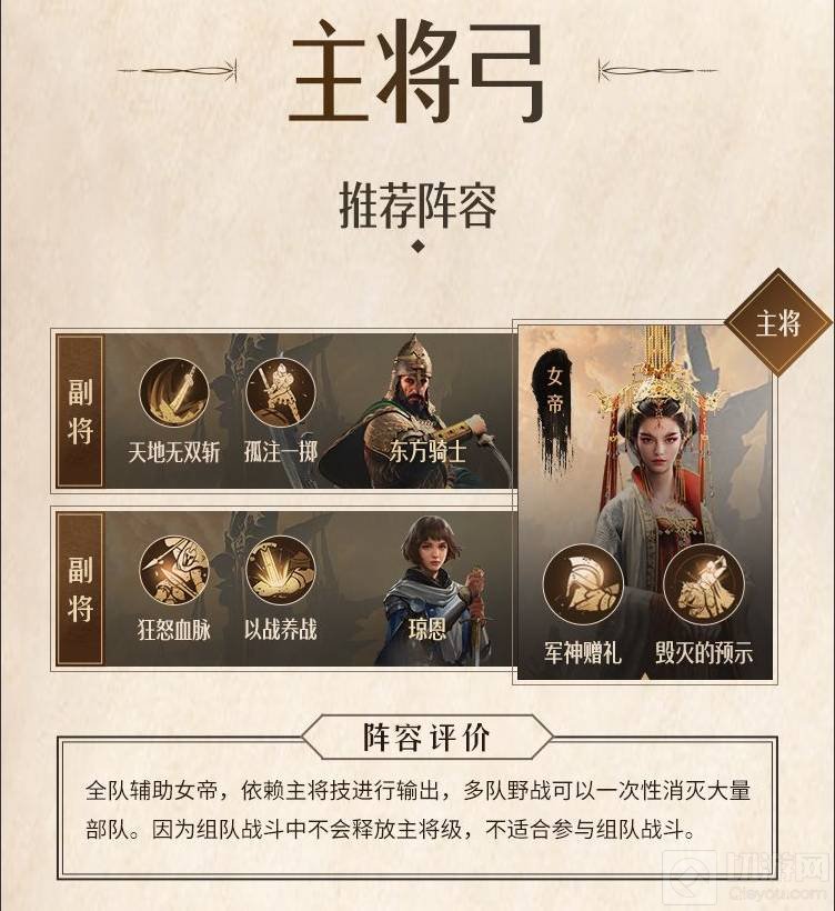 6、主将弓阵容搭配玩法如下:全队辅助女帝,依赖主将技进行输出,多队野战可以一次性消灭大量部队。因为组队战斗中不会释放主将级,不适合参与组队战斗。