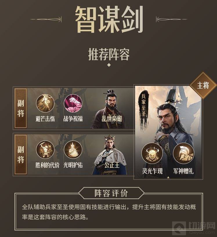 5、智谋剑阵容搭配玩法如下:全队辅助兵家至圣使用固有技能进行输出,提升主将固有技能发动概率是这套阵容的核心思路。