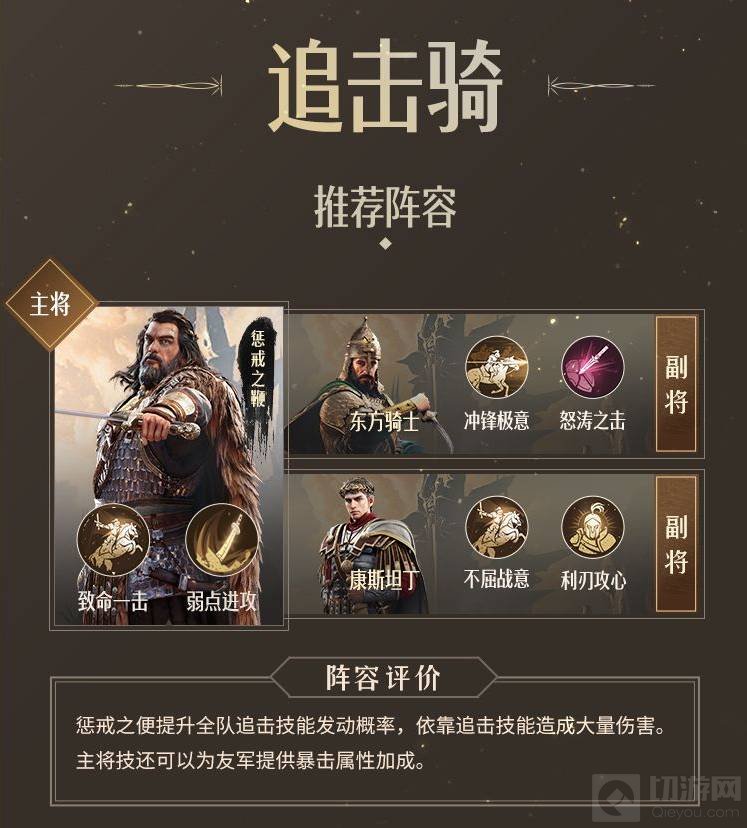 2、追击骑阵容搭配玩法如下:惩戒之便提升全队追击技能发动概率,依靠追击技能造成大量伤害。主将技还可以为友军提供暴击属性加成。