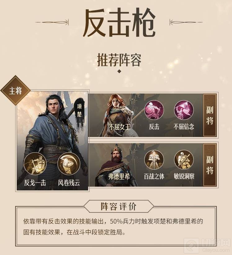 3、反击枪阵容搭配玩法如下:依靠带有反击效果的技能输出,50%兵力时触发项楚和弗德里希的固有技能效果,在战斗中段锁定胜局。
