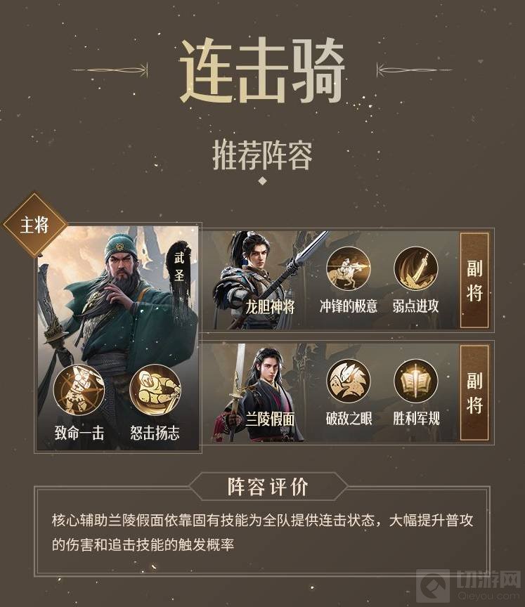 1、连击骑阵容搭配玩法如下:核心辅助兰陵假面依靠固有技能为全队提供连击状态,大幅提升普攻的伤害和追击技能的触发概率。