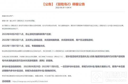 腾讯《冒险岛2》今日宣布,由于与游戏开发商的代理协议即将到期,经与开发商友好协商,《冒险岛2》即将于2022年11月02日11点正式停止游戏运营,关闭游戏服务器,关闭游戏官网,用户无法登陆游戏。官方为玩家们准备了补偿活动,时间为2022年08月29日至2022年11月02日。