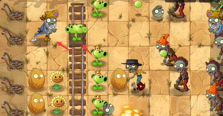 3、接着在铲车上种植双向豌豆射手来攻击待会出现的淘金僵尸。