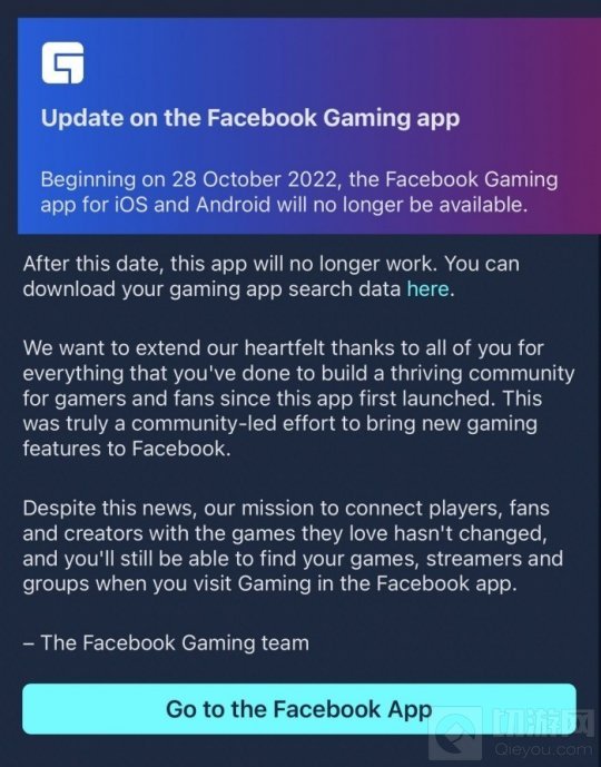 Facebook对此表示,"尽管公布了这个消息,我们将玩家、粉丝和创作者与他们所喜爱的游戏联系起来的使命并没有改变,当你访问Facebook应用中的游戏时,你仍然能够找到你的游戏、串流和小组"。